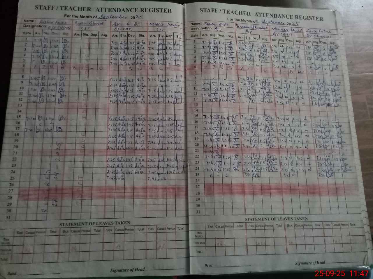| Total no. of Classrooms: 11 No. of Classrooms Used for Teaching: 10 No. of Classrooms Storing Old Furniture, FTBs, etc: 0Comments if Any: One teacher name Fouzia Shoukat EST on Idat leave Random class check list not updated in pmiu application |