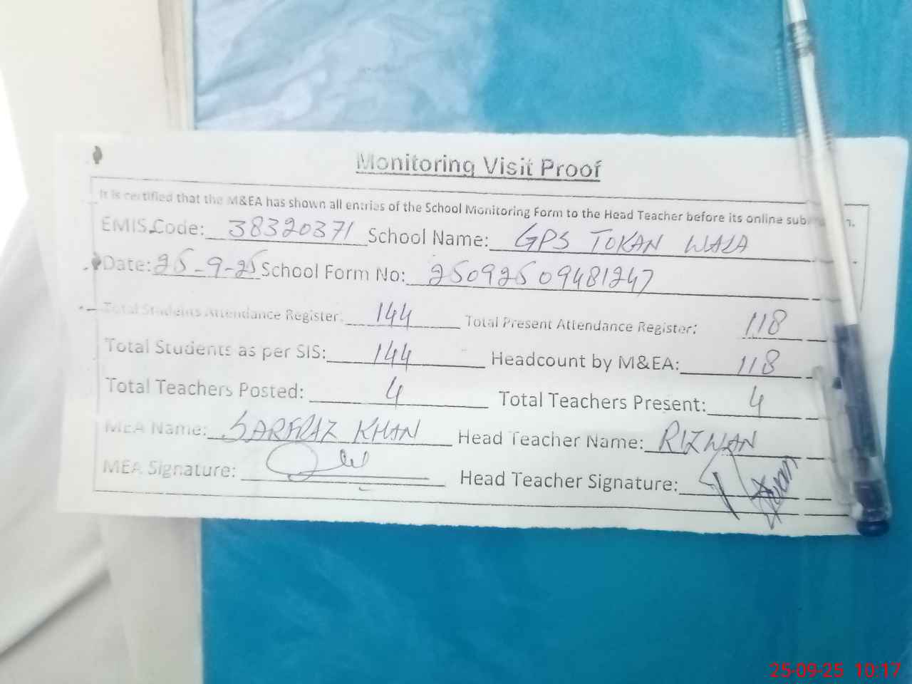 | Attendance Register | Head Teacher | MEA with School | Visit Proof |
