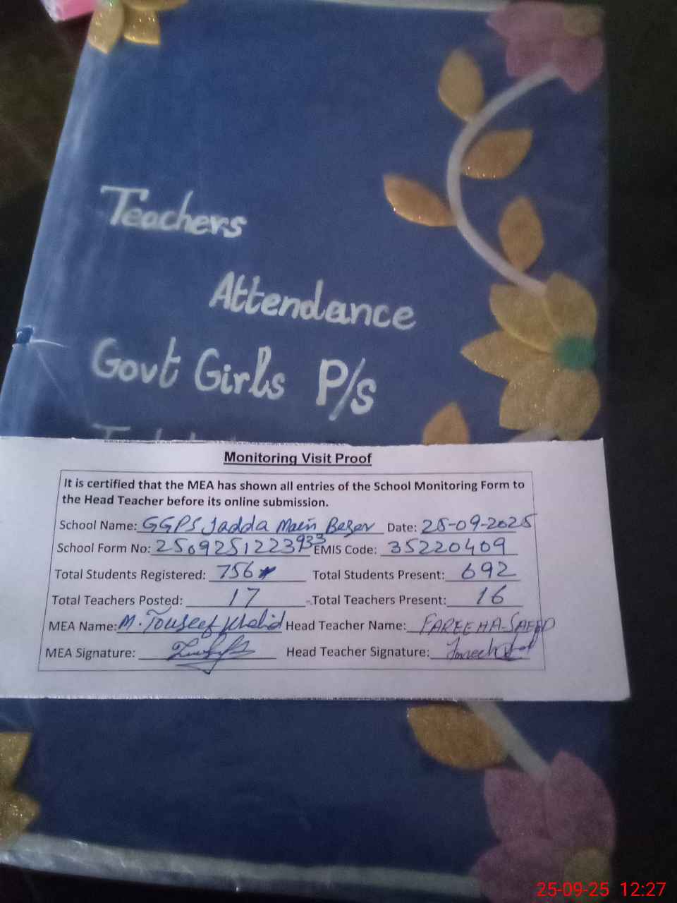 | Attendance Register | Head Teacher | MEA with School | Visit Proof |