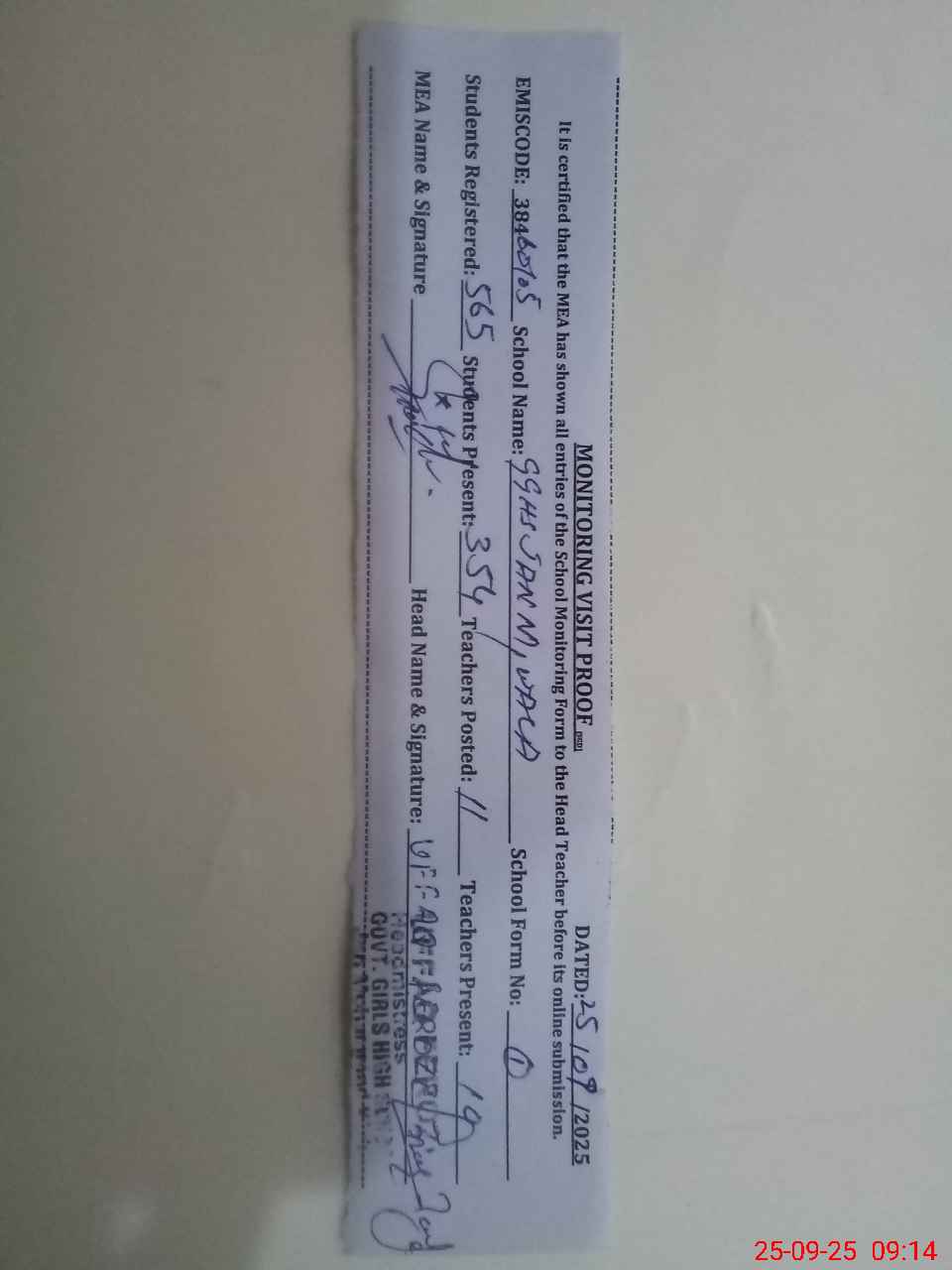 | Certified that this School was Inspected by the Undersigned MEA/DMO Today and the Information Stated Above is as Per Record. | |||||