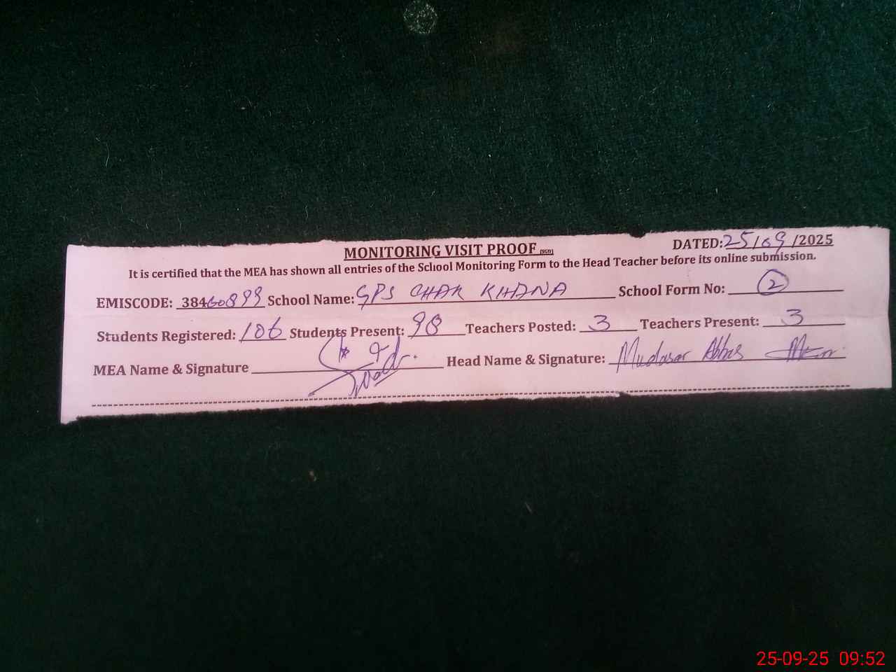 | Attendance Register | Head Teacher | MEA with School | Visit Proof |
