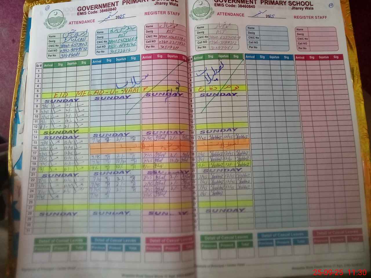 | CNIC | Full Name | Designation | R/C | Absence during last cal. month |