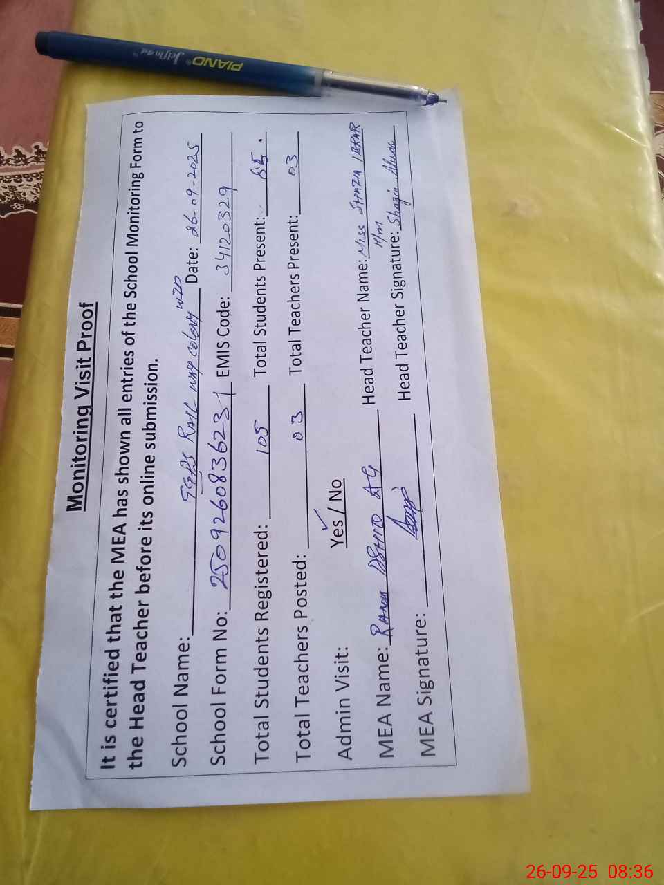 | Attendance Register | Head Teacher | MEA with School | Visit Proof |