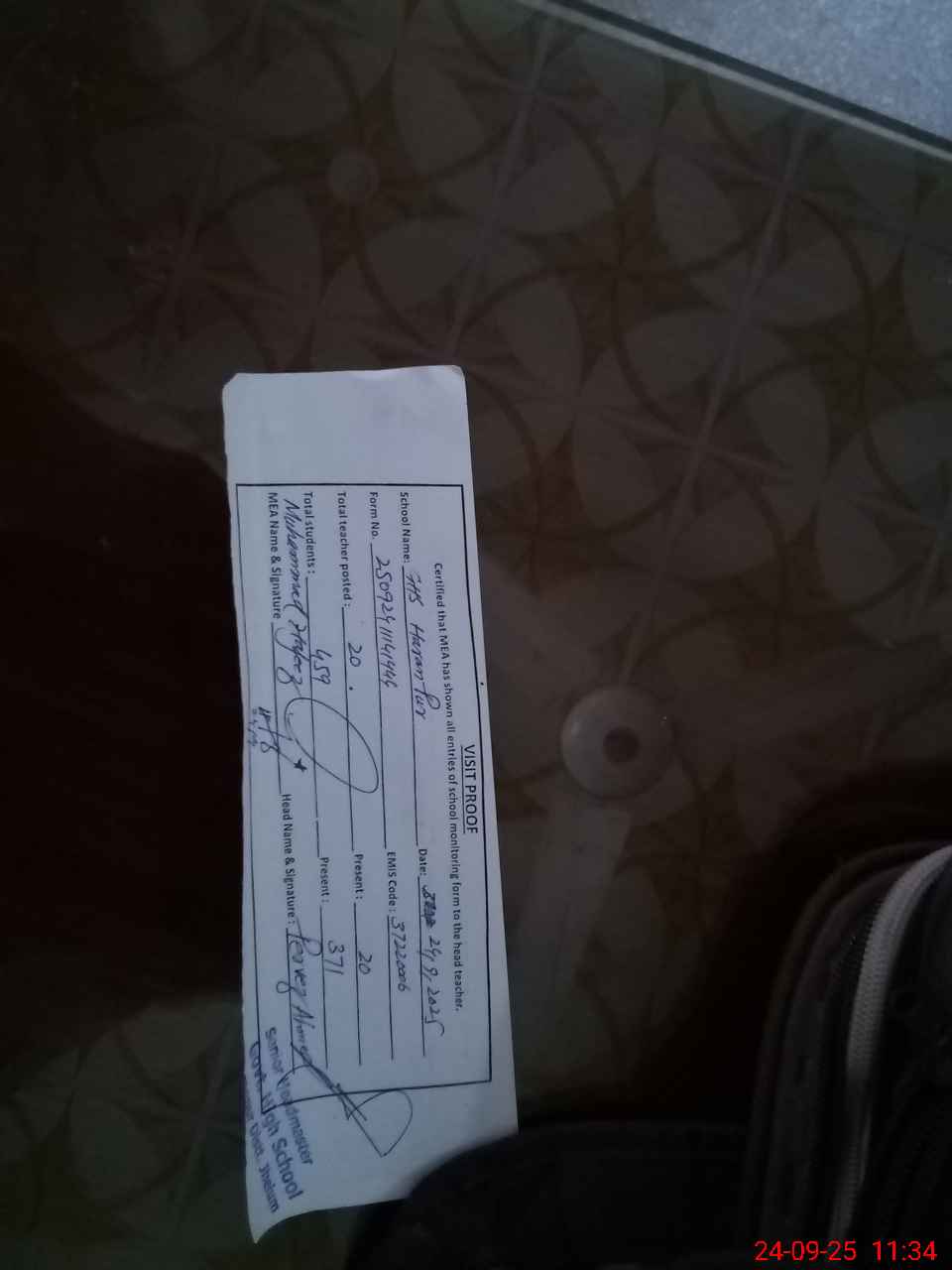 | Attendance Register | Head Teacher | MEA with School | Visit Proof |