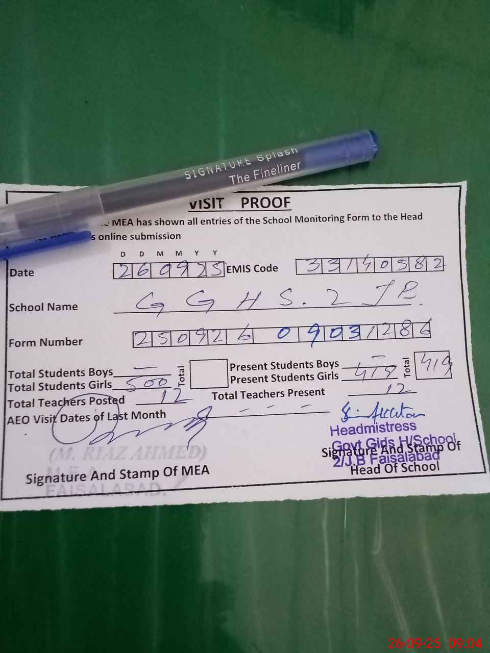 | Attendance Register | Head Teacher | MEA with School | Visit Proof |