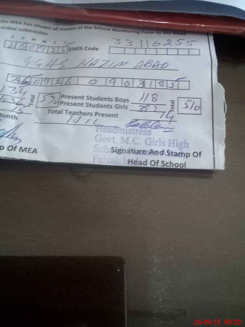 | EMIS Code: 33110255 | Name of School: GGHS MC NAZIM ABAD | |||