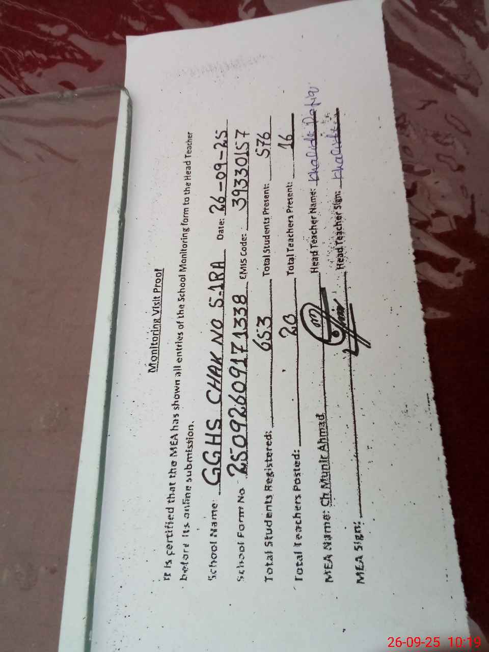 | EMIS Code: 39330157 | Name of School: GGHS CHAK NO. 5-1/RA | |||