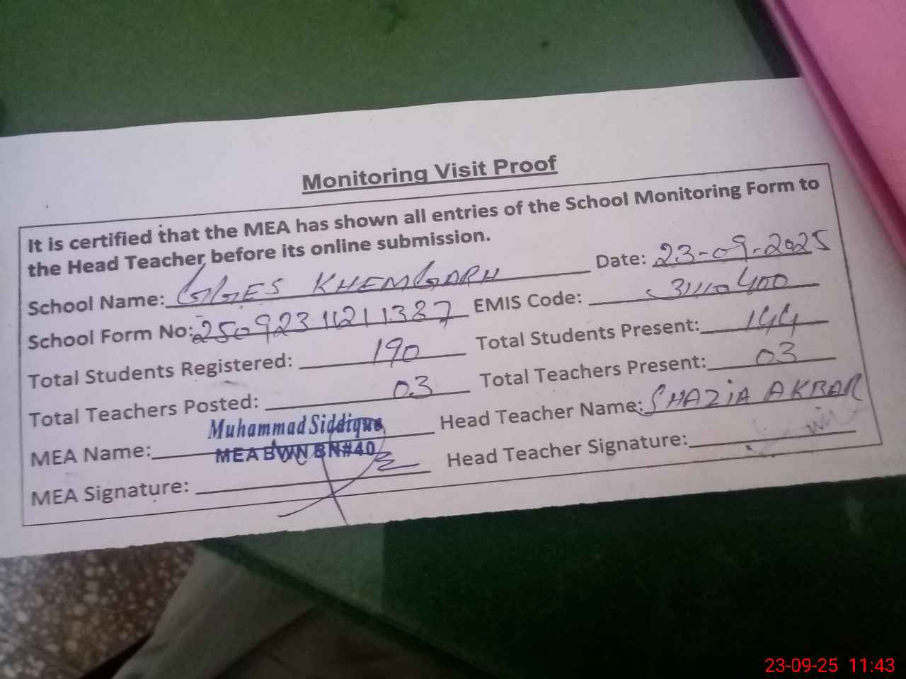 | Attendance Register | Head Teacher | MEA with School | Visit Proof |