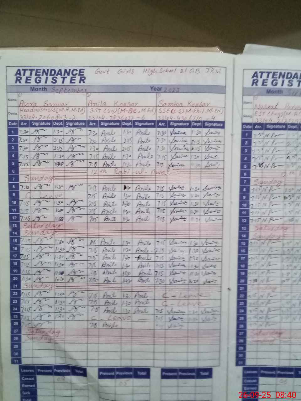 | CNIC | Full Name | Designation | R/C | Absence During Last Calender Month |