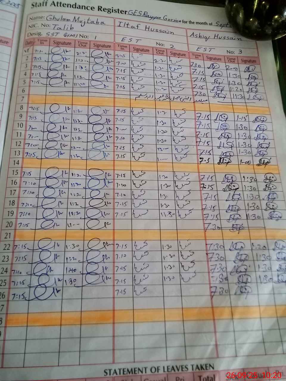 | CNIC | Full Name | Designation | R/C | Absence During Last Calender Month |