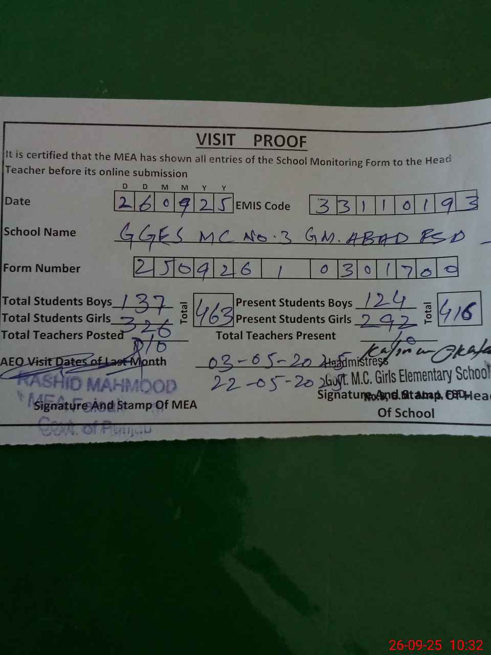 | Attendance Register | Head Teacher | MEA with School | Visit Proof |