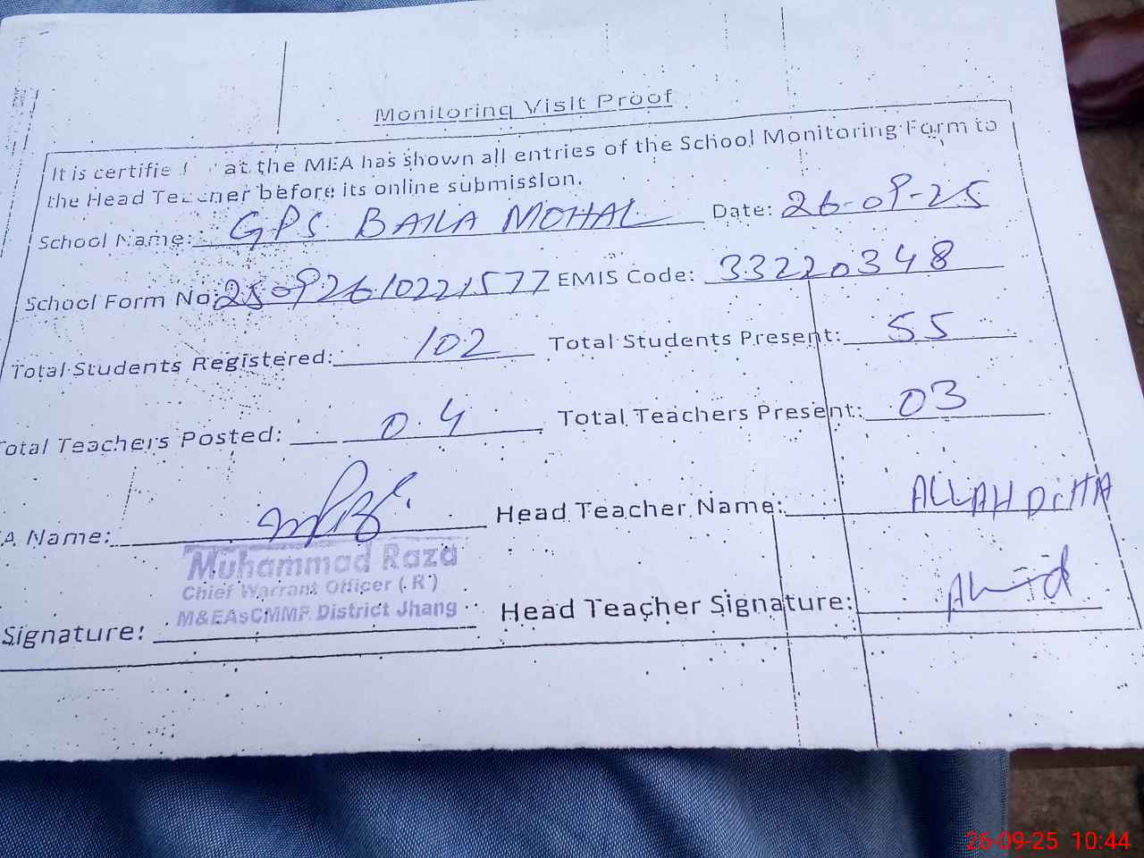 | Attendance Register | Head Teacher | MEA with School | Visit Proof |