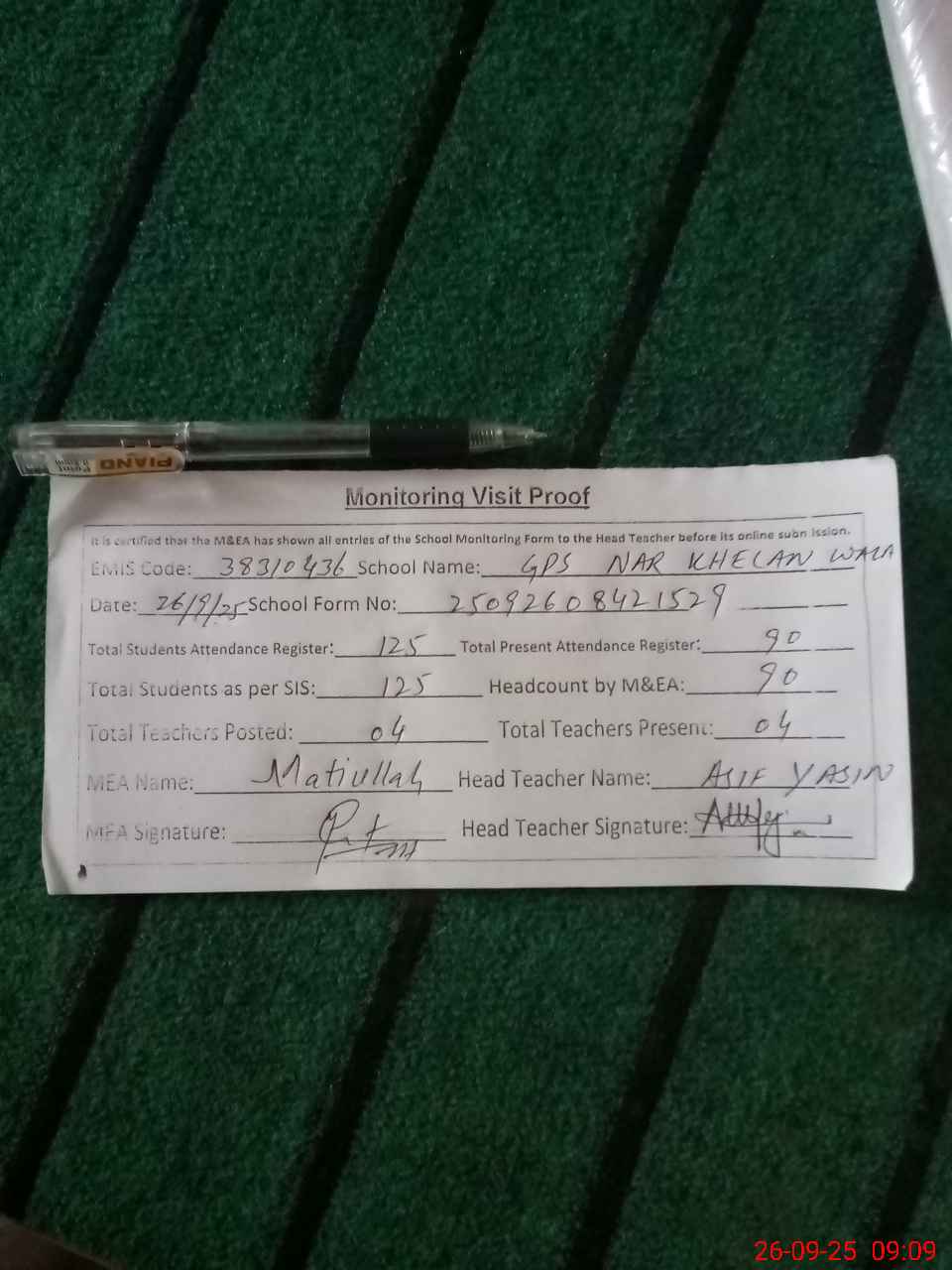 | Attendance Register | Head Teacher | MEA with School | Visit Proof |