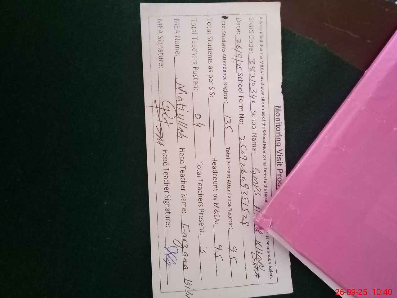 | Attendance Register | Head Teacher | MEA with School | Visit Proof |
