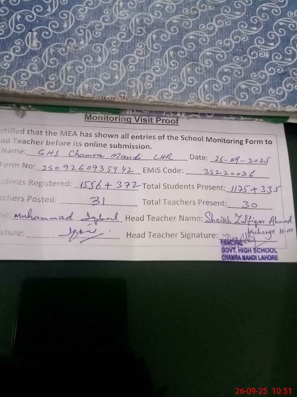 | EMIS Code: 35220036 | Name of School: GHS CHAMRA MANDI LAHORE | |||