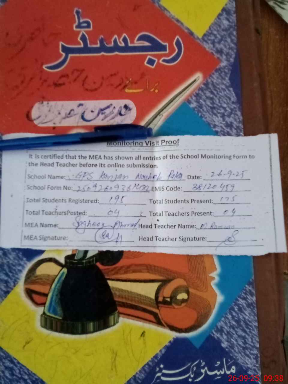 | Attendance Register | Head Teacher | MEA with School | Visit Proof |