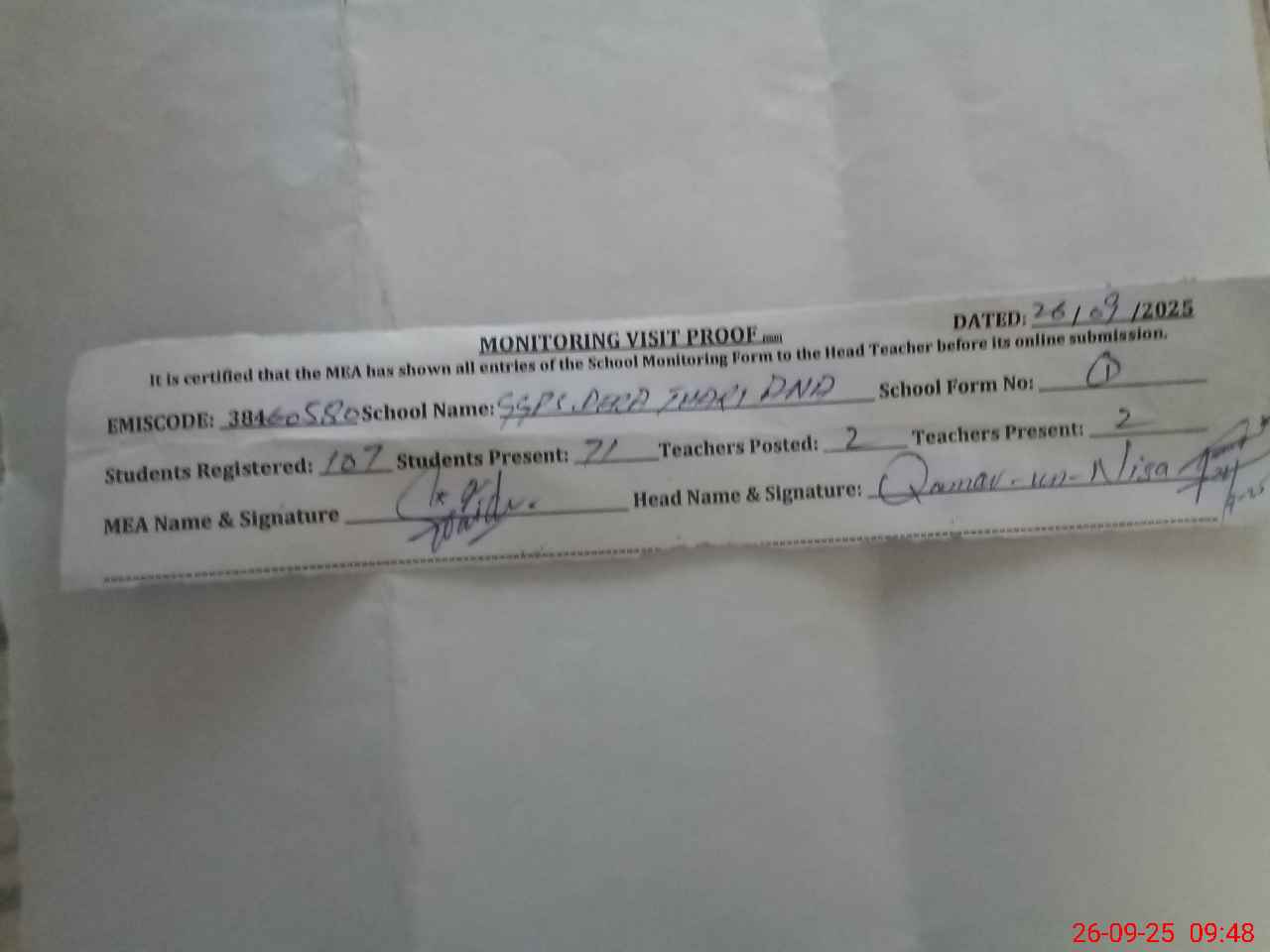 | Certified that this School was Inspected by the Undersigned MEA/DMO Today and the Information Stated Above is as Per Record. | |||||