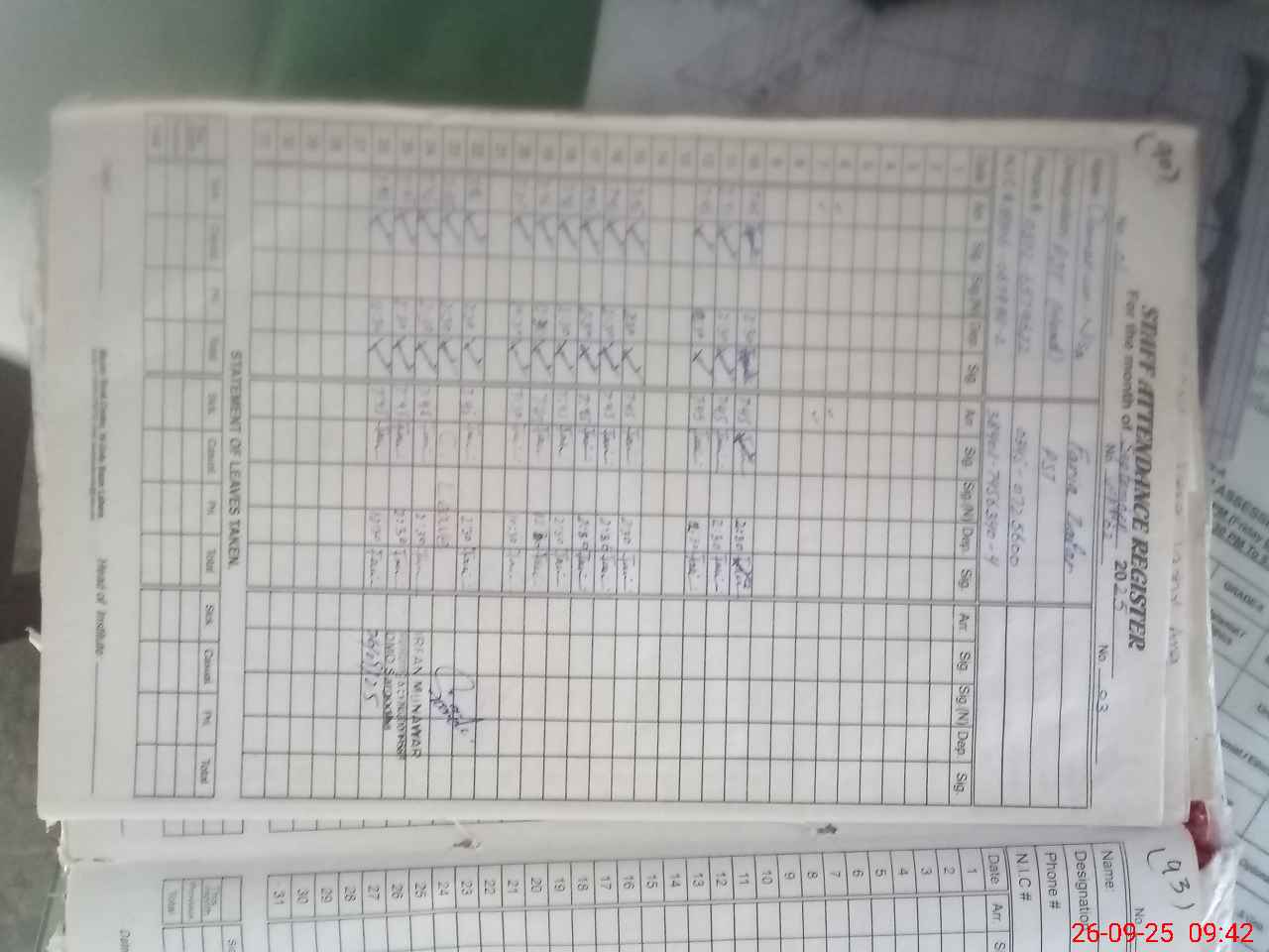 | CNIC | Full Name | Designation | R/C | Absence during last cal. month |