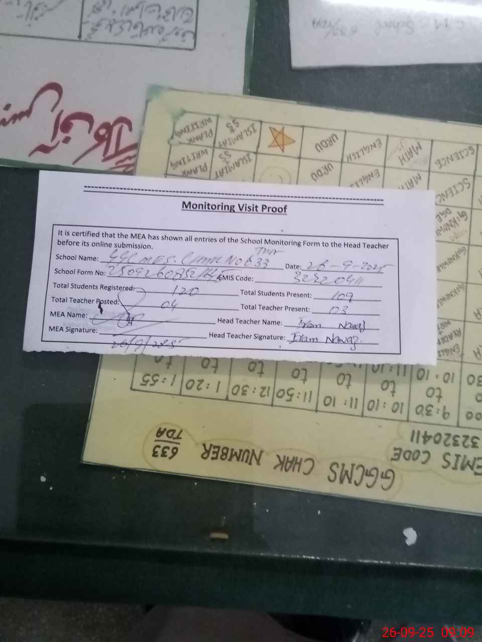 | Attendance Register | Head Teacher | MEA with School | Visit Proof |