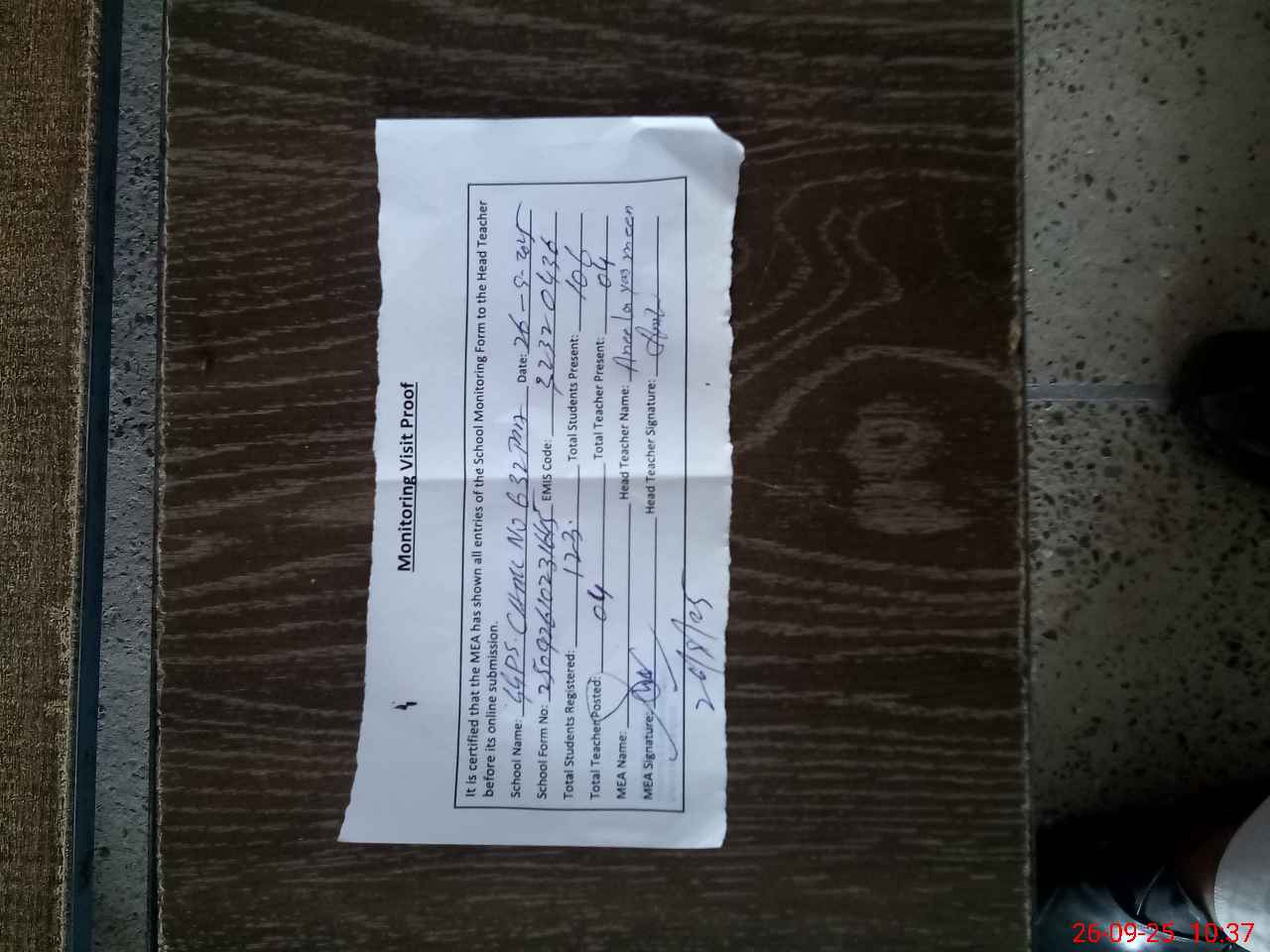 | Attendance Register | Head Teacher | MEA with School | Visit Proof |