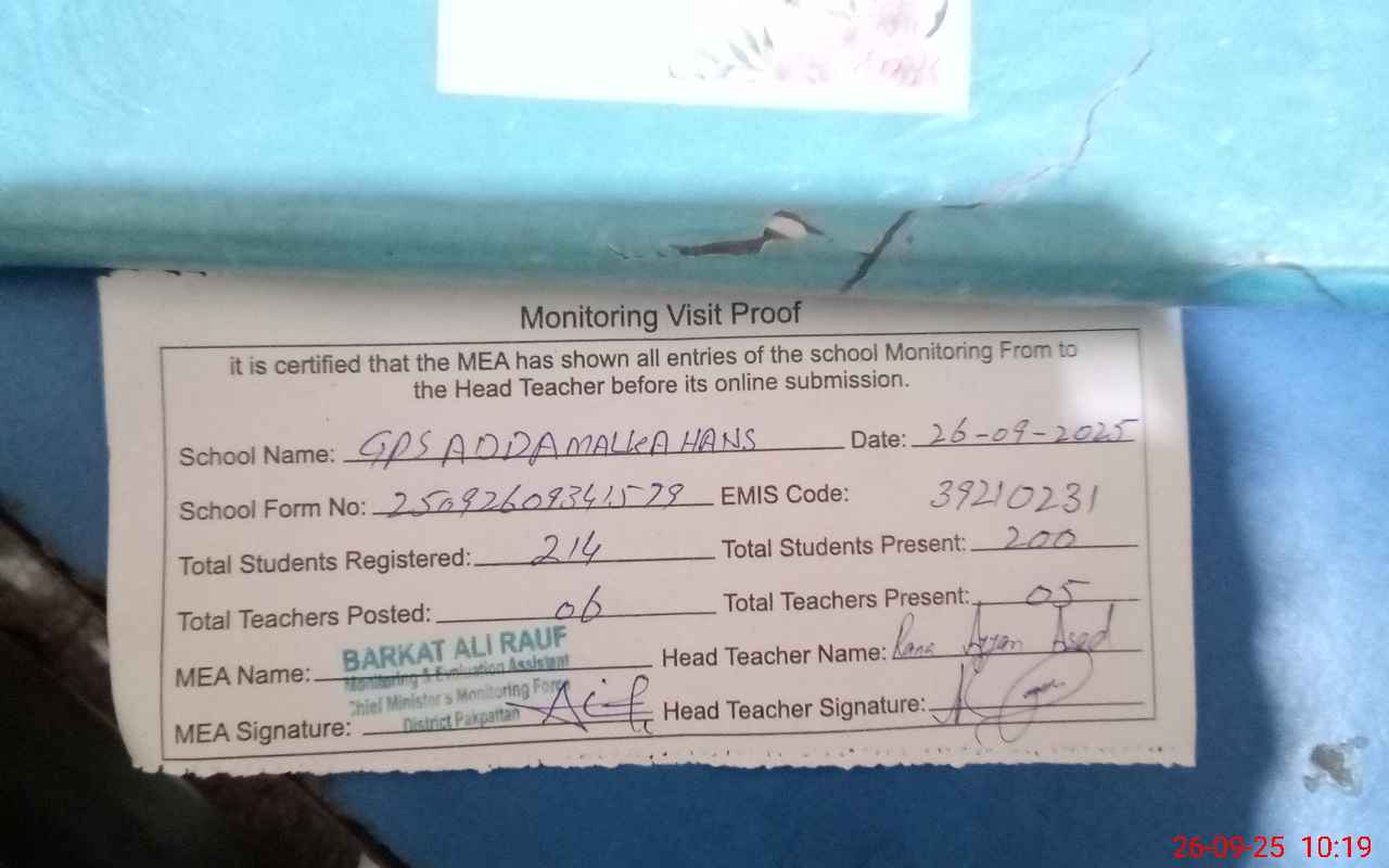 | EMIS Code: 39210231 | Name of School: GPS ADDA MALKA HANS | |||