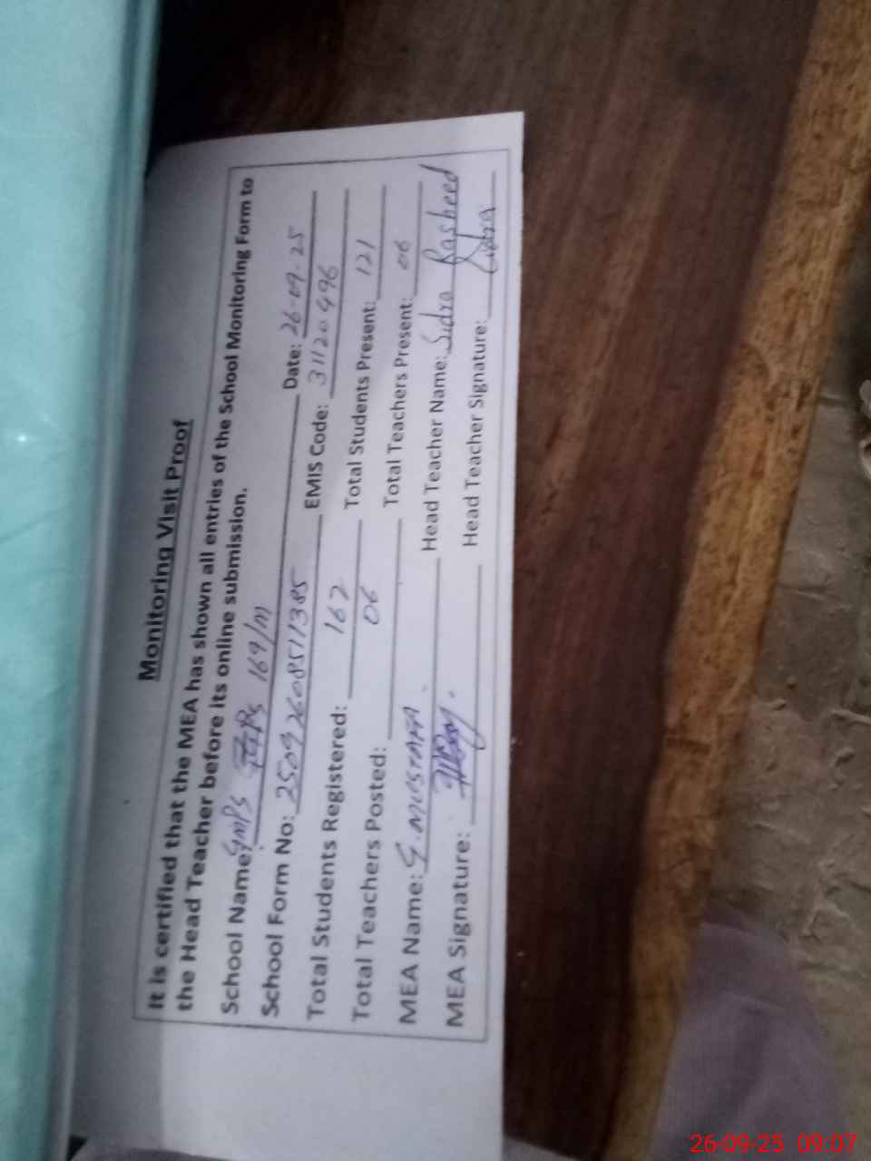 | Attendance Register | Head Teacher | MEA with School | Visit Proof |