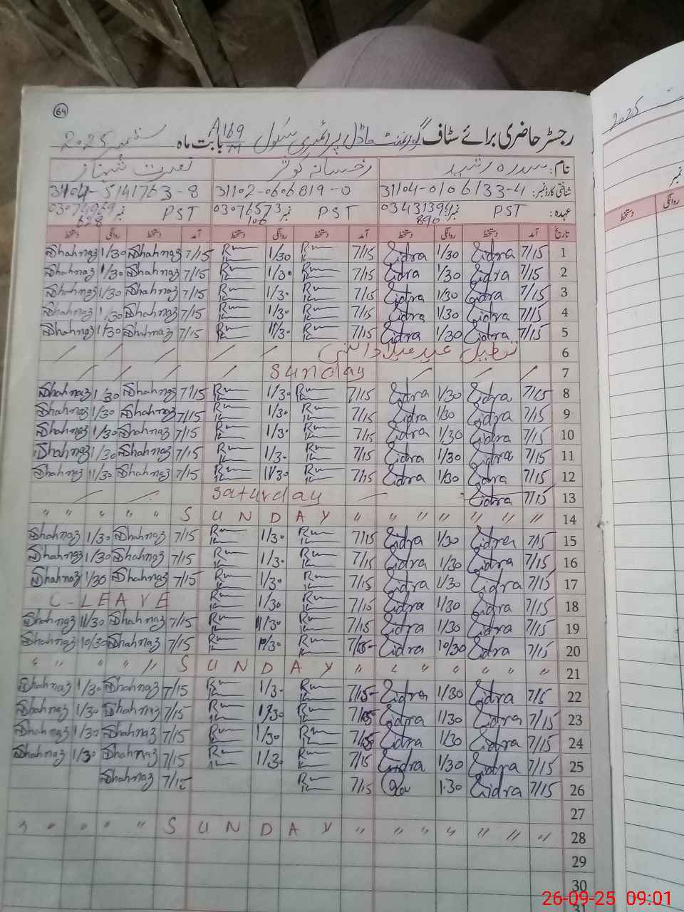 | Name: SI**** RA**** Designation: (School Headmaster's/Headmistress's) PST Phone/Cell Number: 03**** |