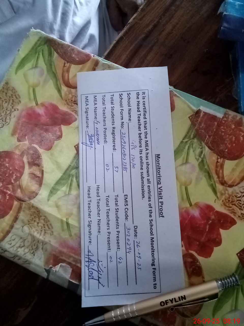 | Certified that this School was Inspected by the Undersigned MEA/DMO Today and the Information Stated Above is as Per Record. | |||||