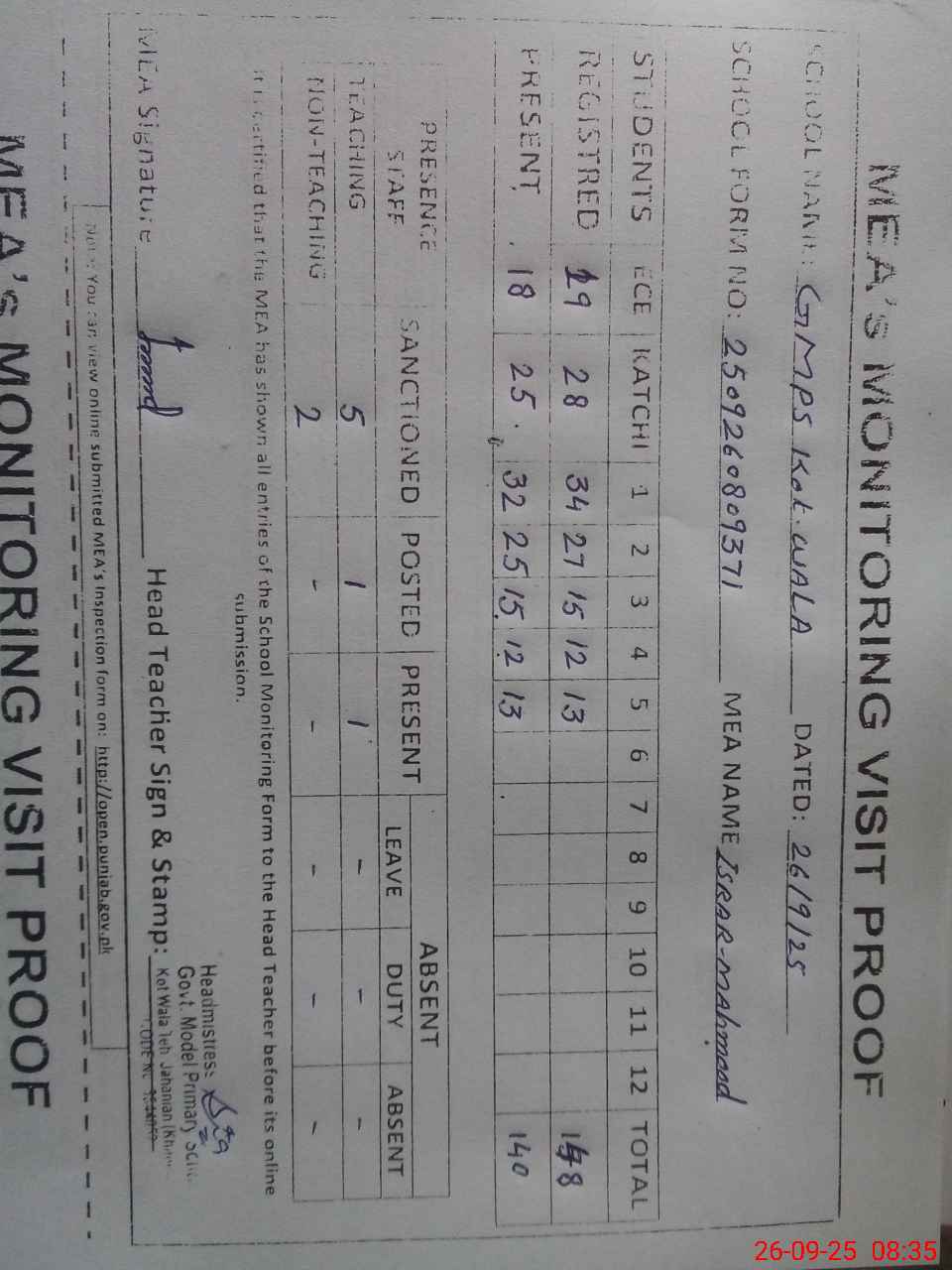 | EMIS Code: 36440529 | Name of School: GMPS KOT WALA, JAHANIAN | |||