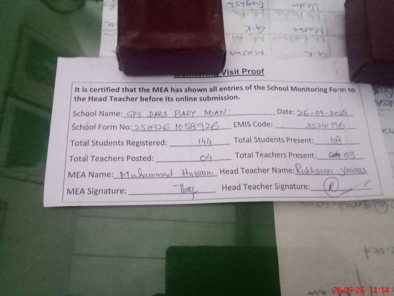 | EMIS Code: 35210196 | Name of School: GPS DARAS BARY MIAN | |||