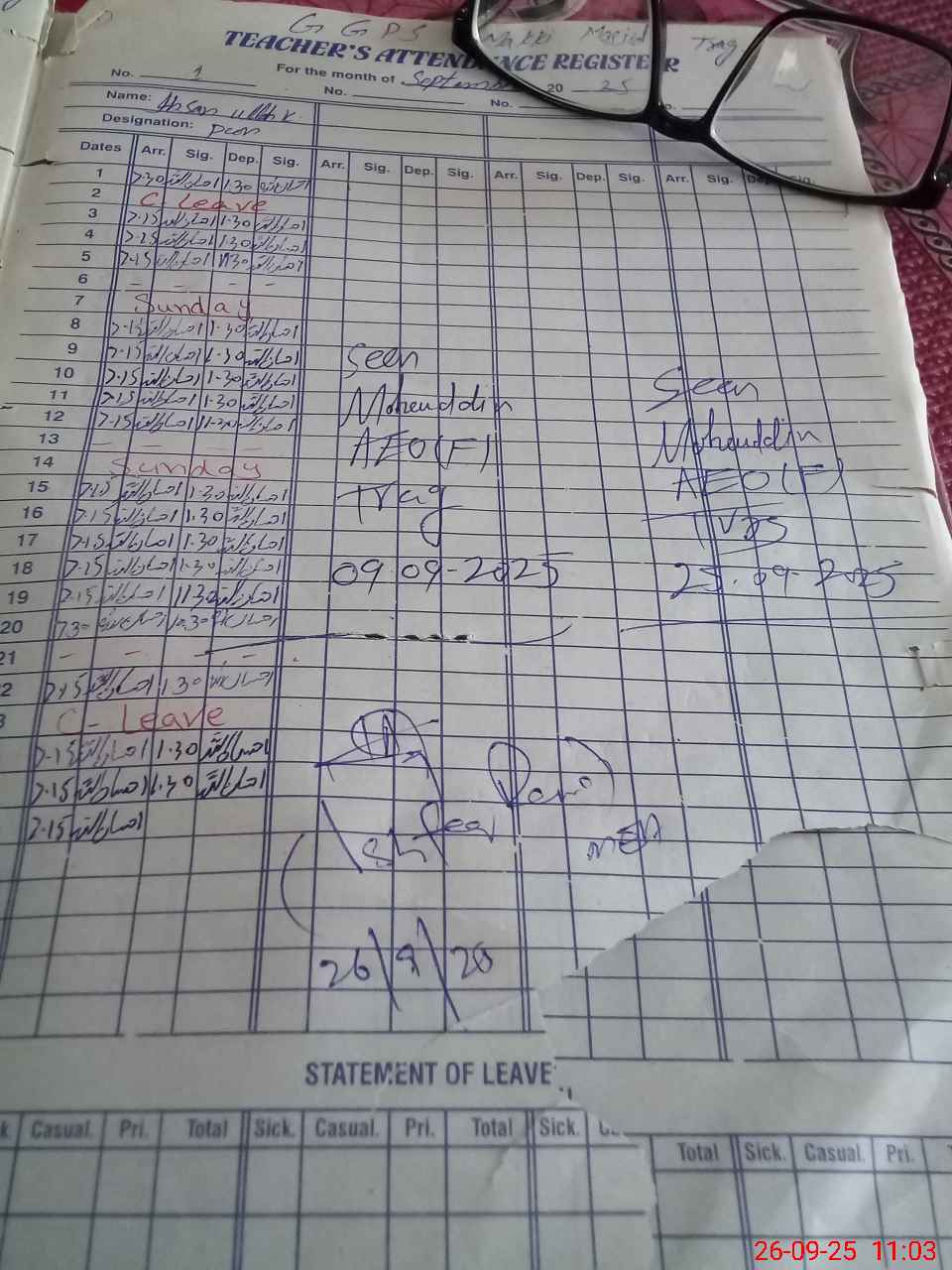 Leave Type | Remarks for Today (Leave,Training, Exam,Absent,Late, Other Duty) |