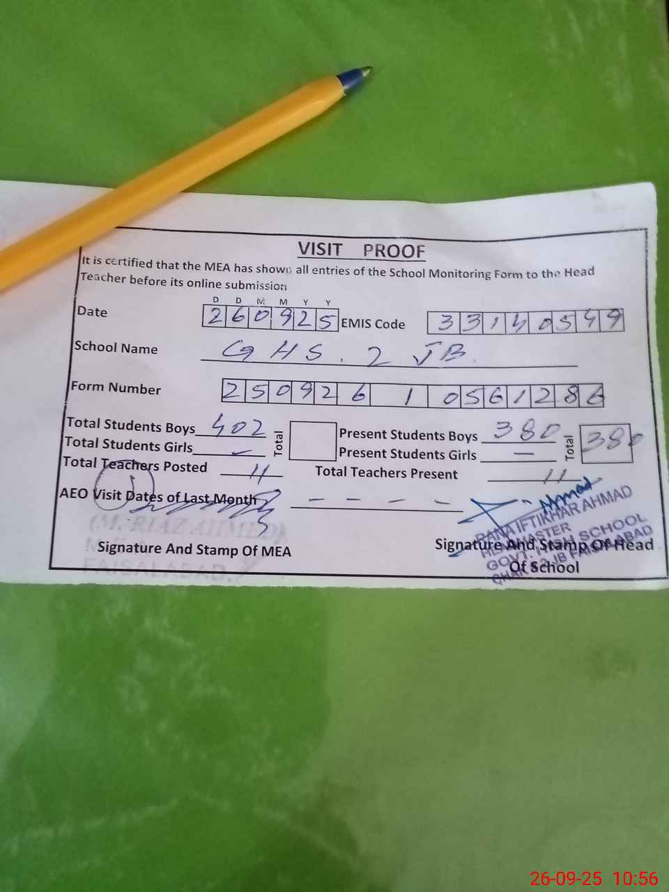 | Attendance Register | Head Teacher | MEA with School | Visit Proof |