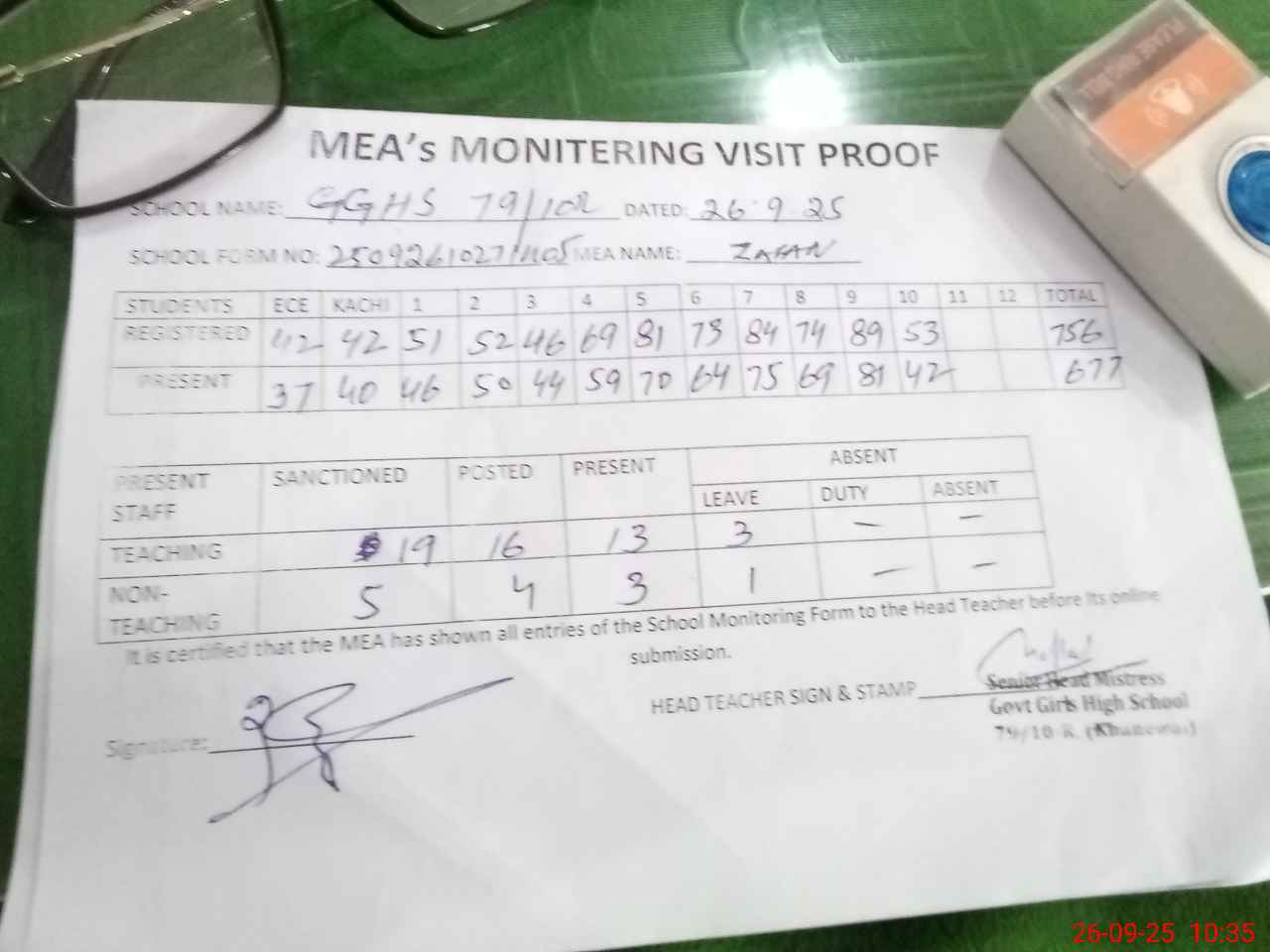 | Attendance Register | Head Teacher | MEA with School | Visit Proof |