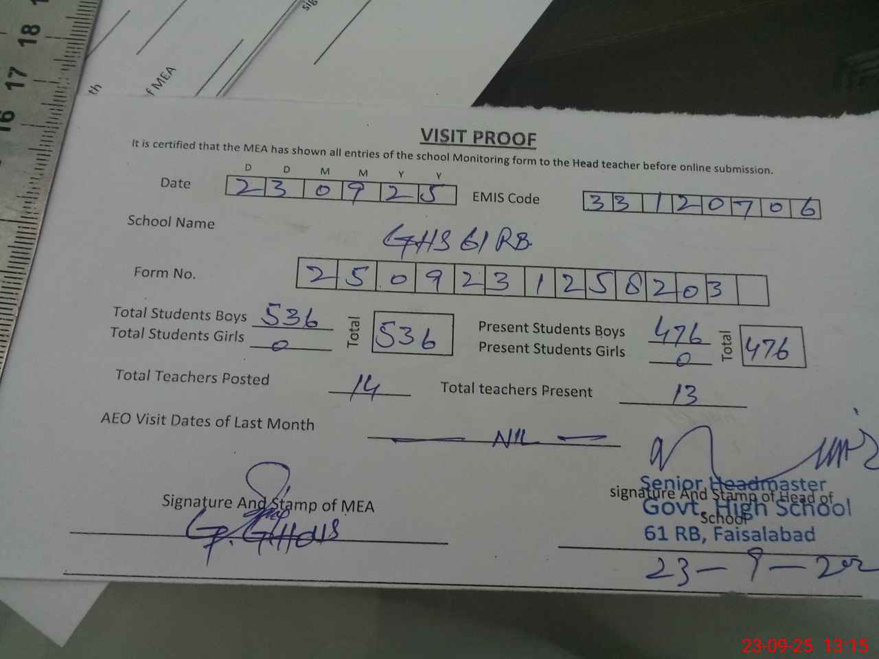 | Attendance Register | Head Teacher | MEA with School | Visit Proof |