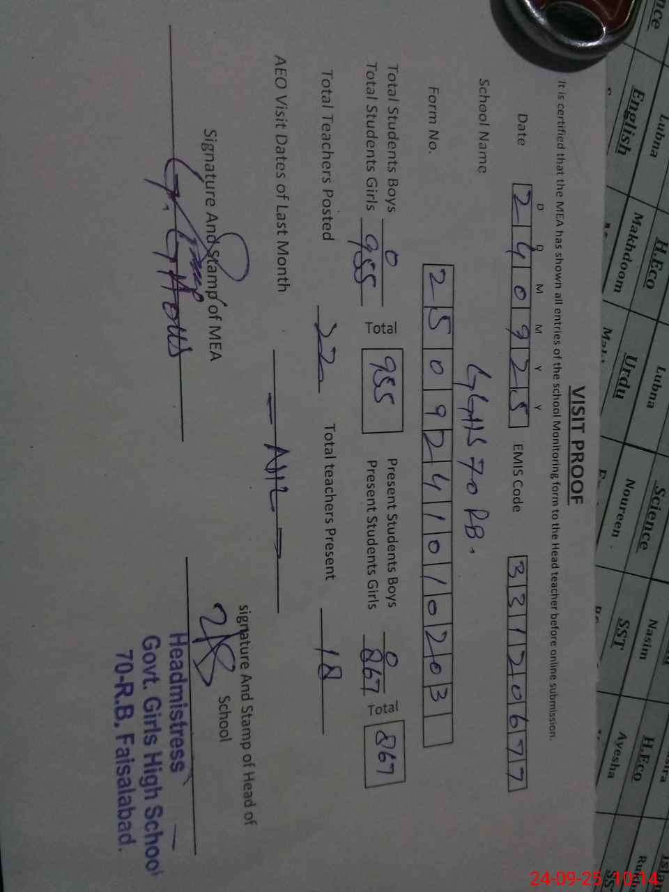 | Attendance Register | Head Teacher | MEA with School | Visit Proof |
