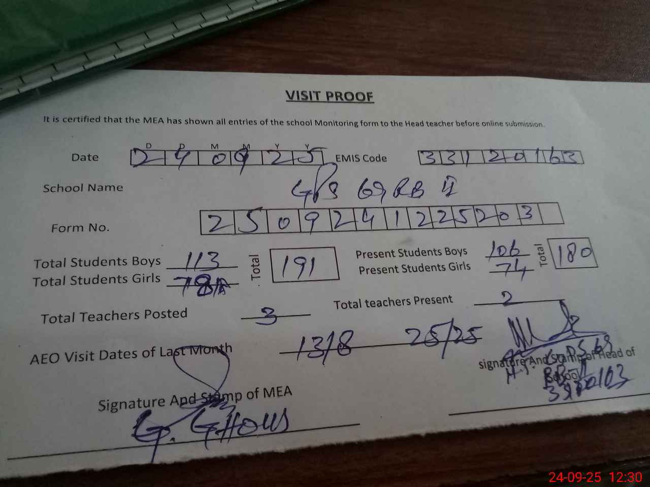 | Attendance Register | Head Teacher | MEA with School | Visit Proof |