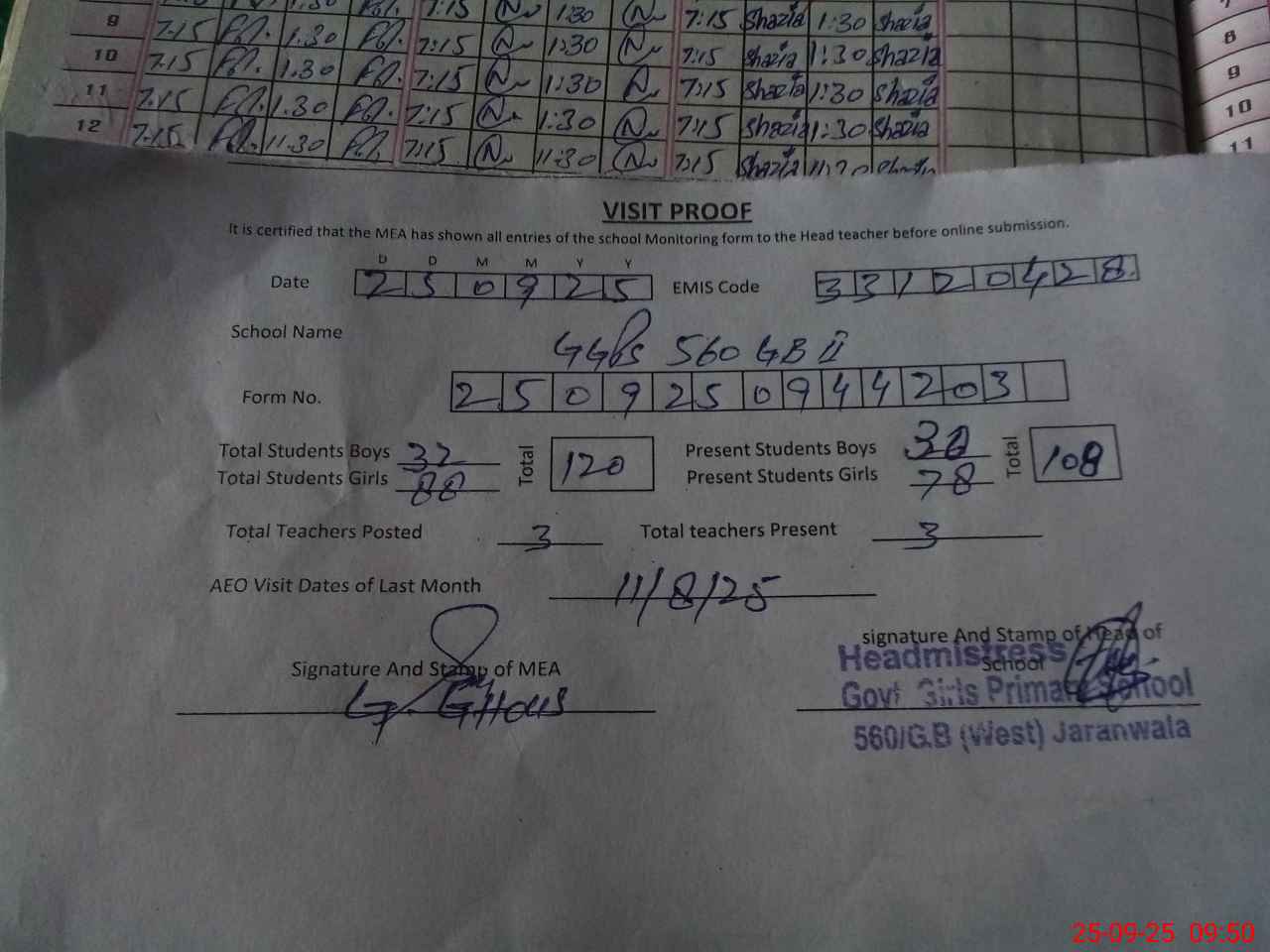 | EMIS Code: 33120428 | Name of School: GGPS CHAK 560 GB II WEST LUNDIANWALA | |||