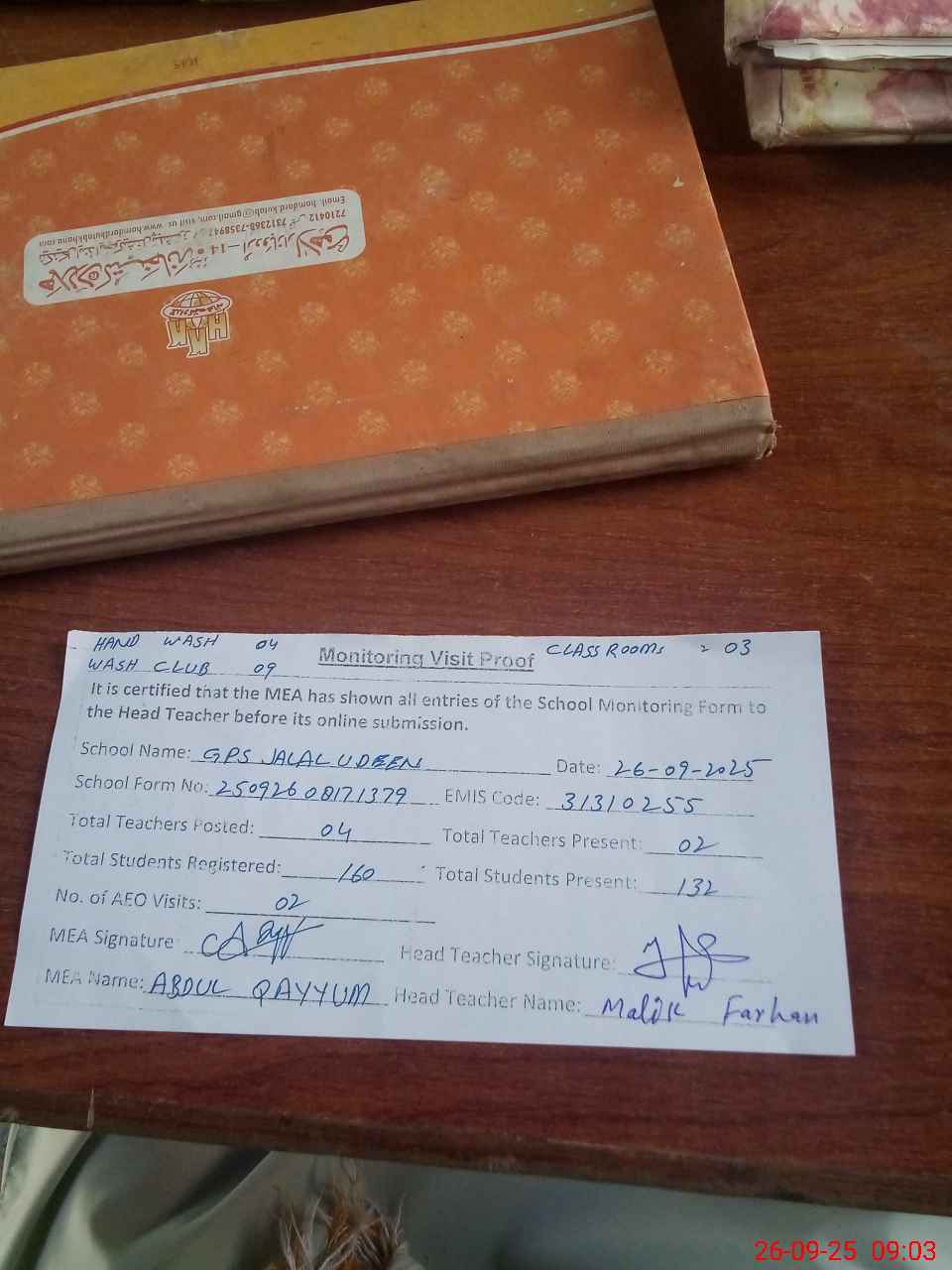 | Attendance Register | Head Teacher | MEA with School | Visit Proof |