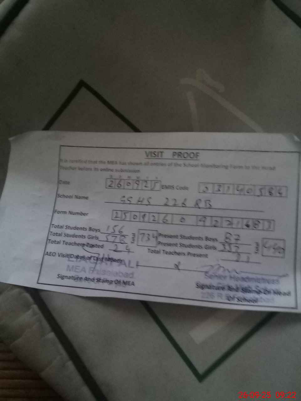 | Attendance Register | Head Teacher | MEA with School | Visit Proof |