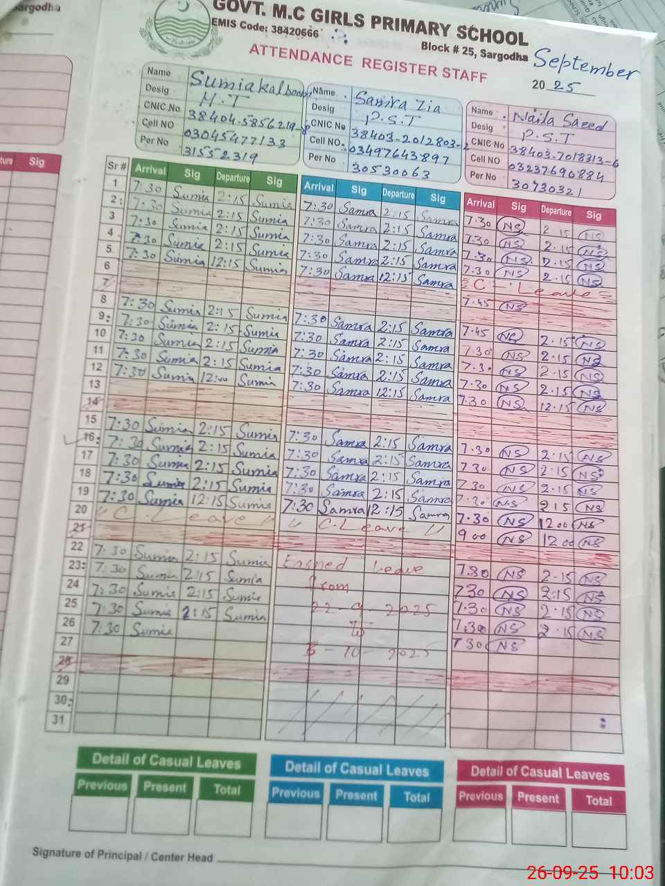 | CNIC | Full Name | Designation | R/C | Absence during last cal. month |