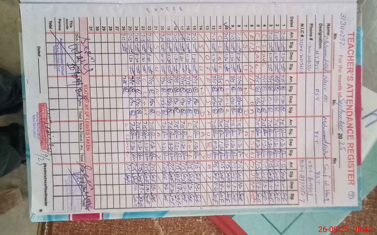 | Attendance Register | Head Teacher | MEA with School | Visit Proof |