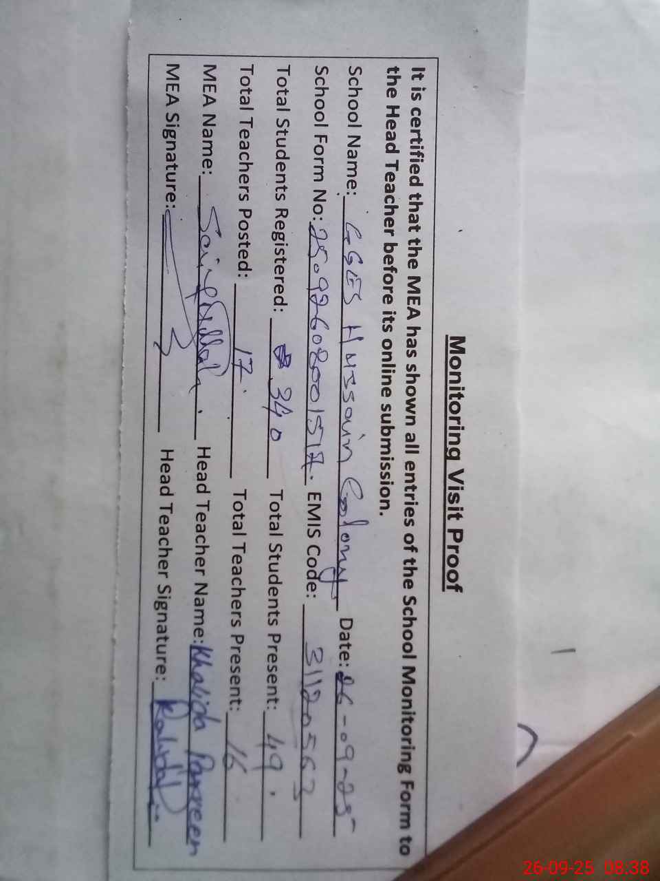 | Attendance Register | Head Teacher | MEA with School | Visit Proof |