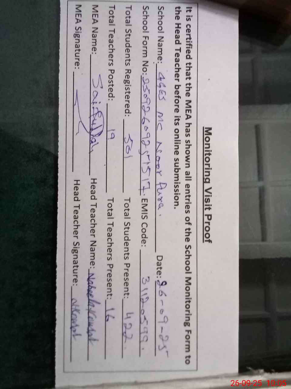 | Attendance Register | Head Teacher | MEA with School | Visit Proof |