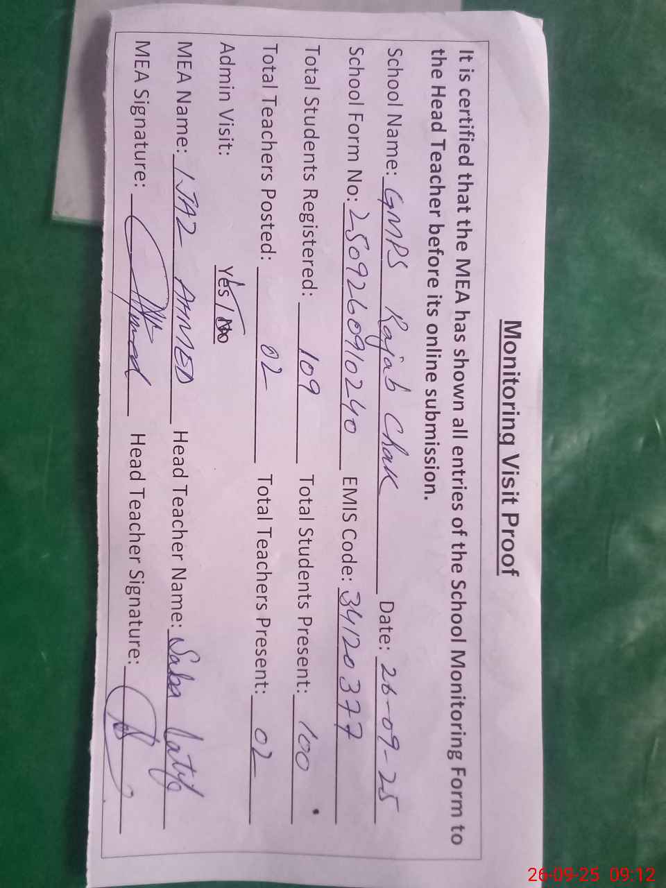 | Attendance Register | Head Teacher | MEA with School | Visit Proof |