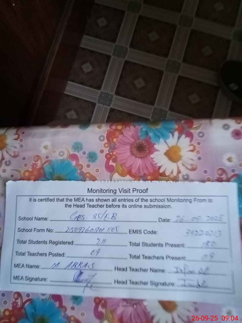 | Attendance Register | Head Teacher | MEA with School | Visit Proof |