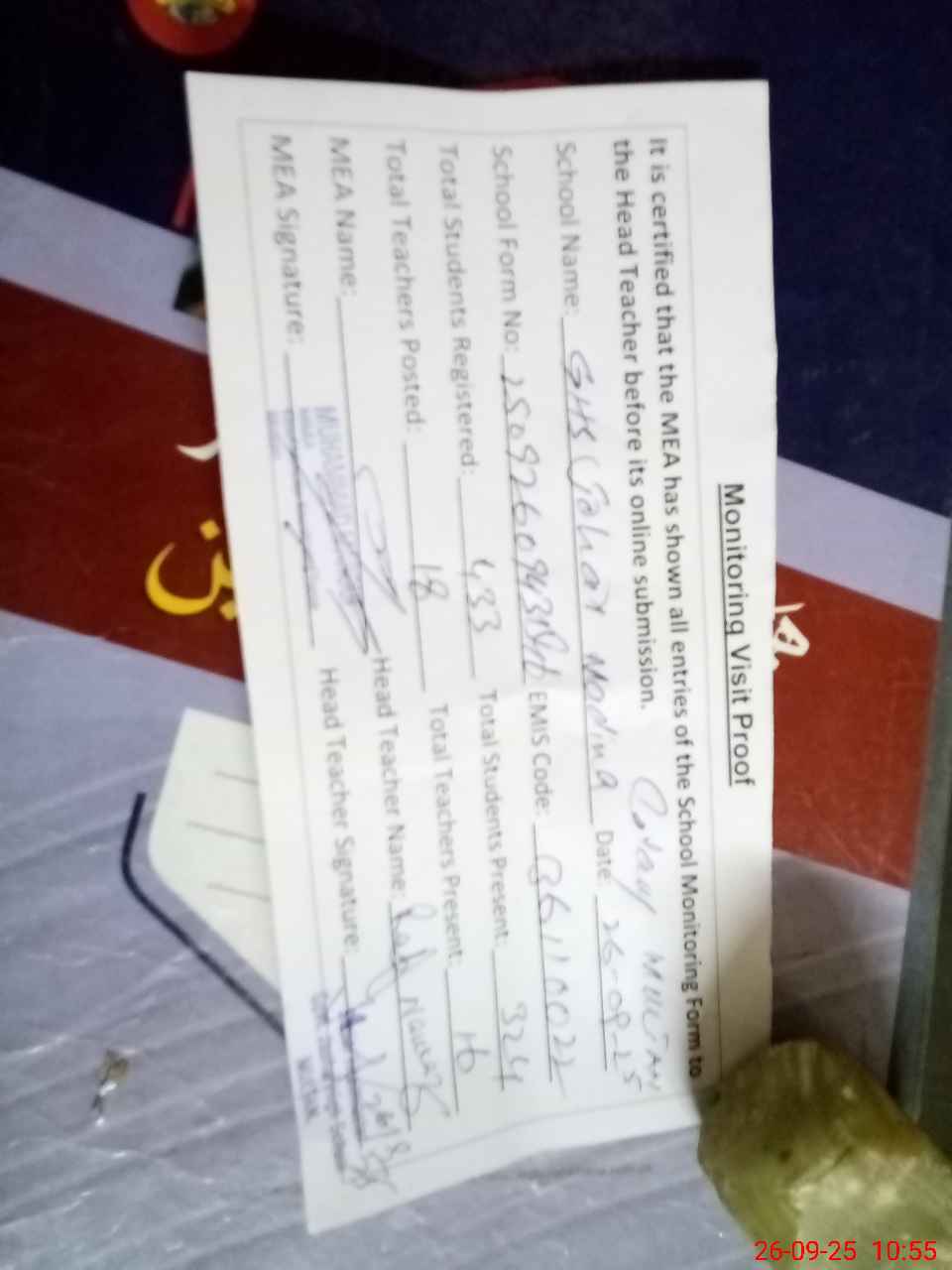 | Attendance Register | Head Teacher | MEA with School | Visit Proof |
