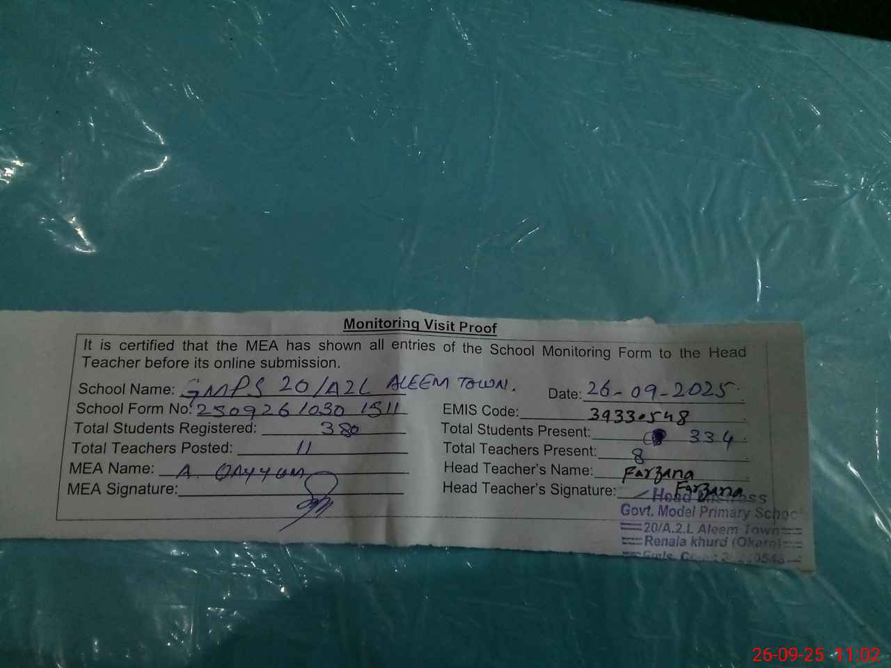| EMIS Code: 39330548 | Name of School: GMPS 20 A-2L (ALEEM TOWN) | |||