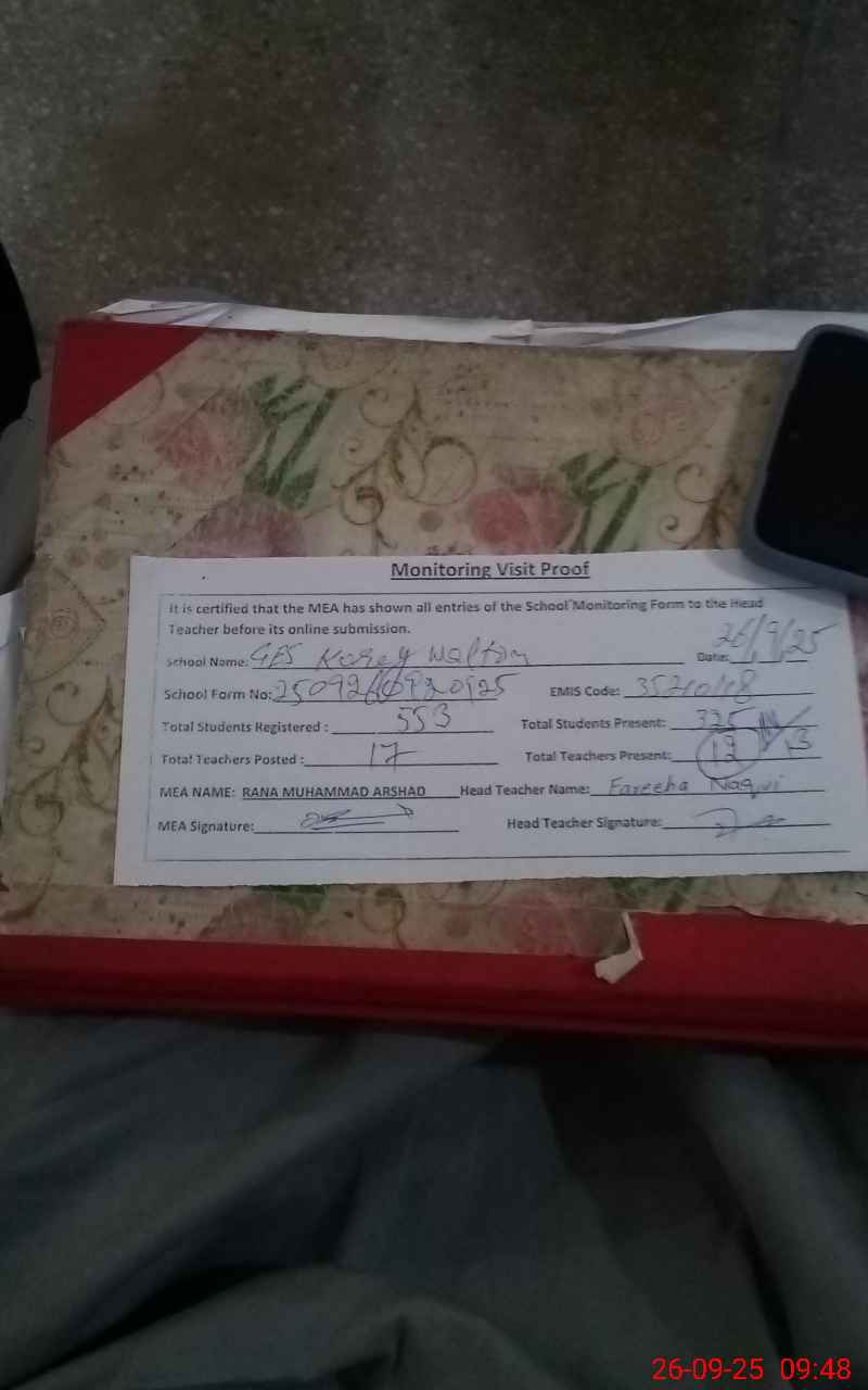 | Remarks (Use Separate Page if Required): Teacher Salah ud din Shehzad EST attendance blank on attendance register at 0830 HRS and he was not physically present in school so according to monitoring sop mark him Absent today Teacher Saher Bashir EST long time Absent from one year but still no action taken against her Teacher Memoona Tabasam PST on Earned leave but her Sanctioned online leave was not available on SIS so according to monitoring sop mark her Absent Rana Hayder Ali NQ attendance blank on attendance register and he was not physically present in school so according to monitoring sop mark him Absent NSB record on register not maintain properly method Students attendance 59 percent today 35210118 | |||||