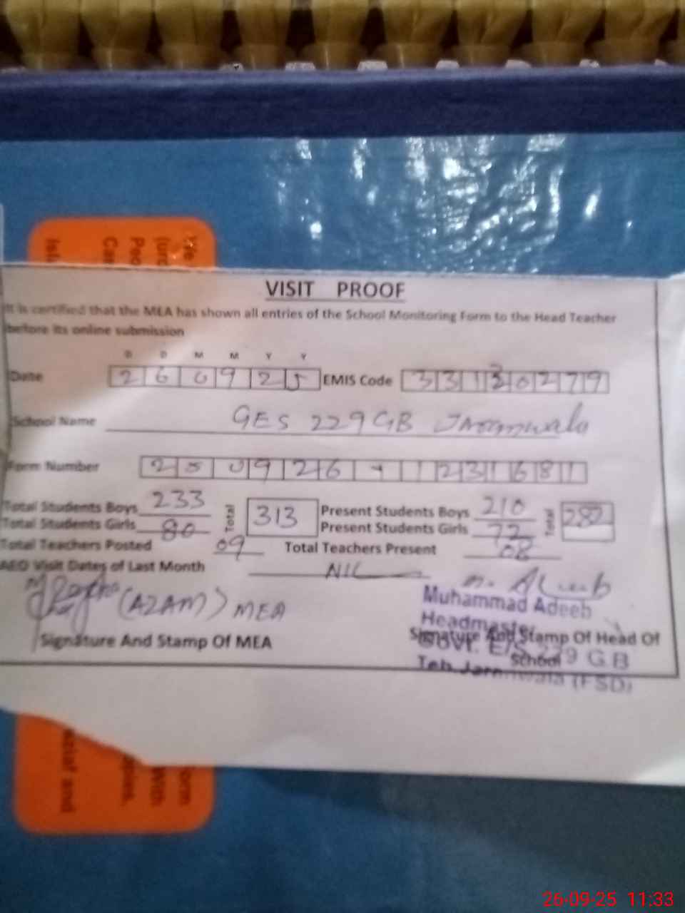 | EMIS Code: 33130279 | Name of School: GES CHAK NO.229/GB | |||