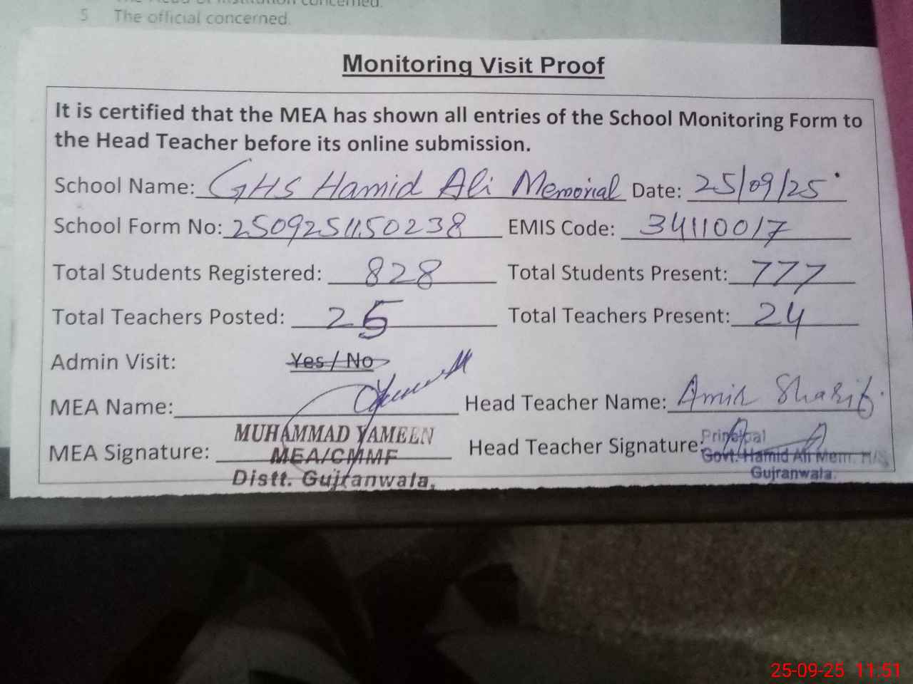 | Attendance Register | Head Teacher | MEA with School | Visit Proof |